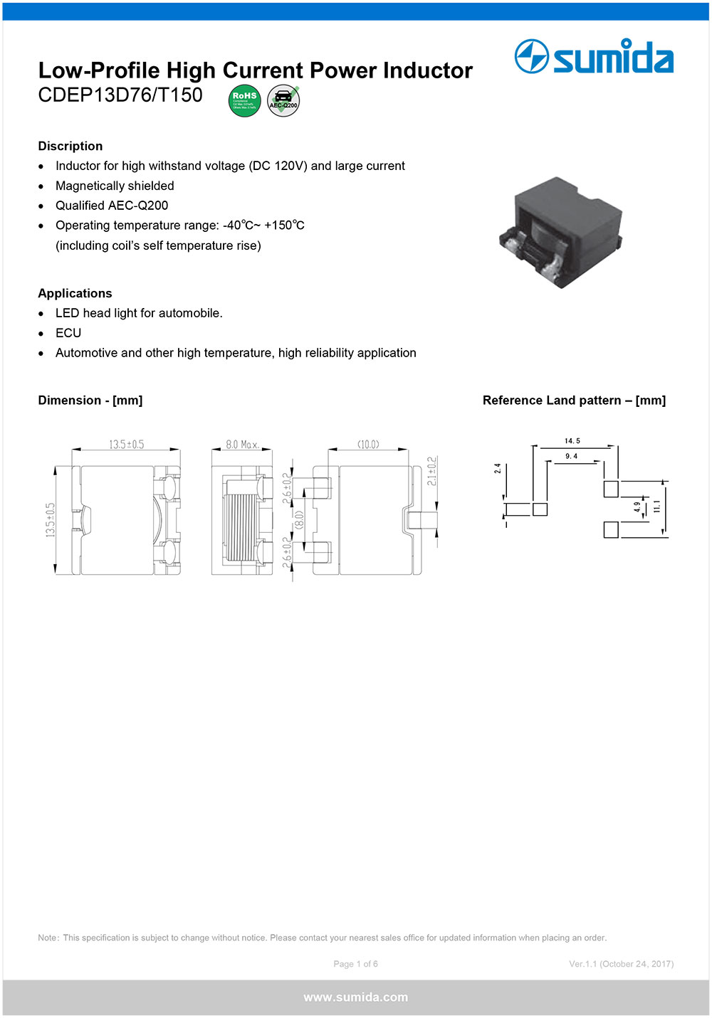 5.CDEP13D76T150廣泛應用于各類汽車大頭燈,ECU電源控制及有車規、高溫要求的DC-DC電源供電模塊,