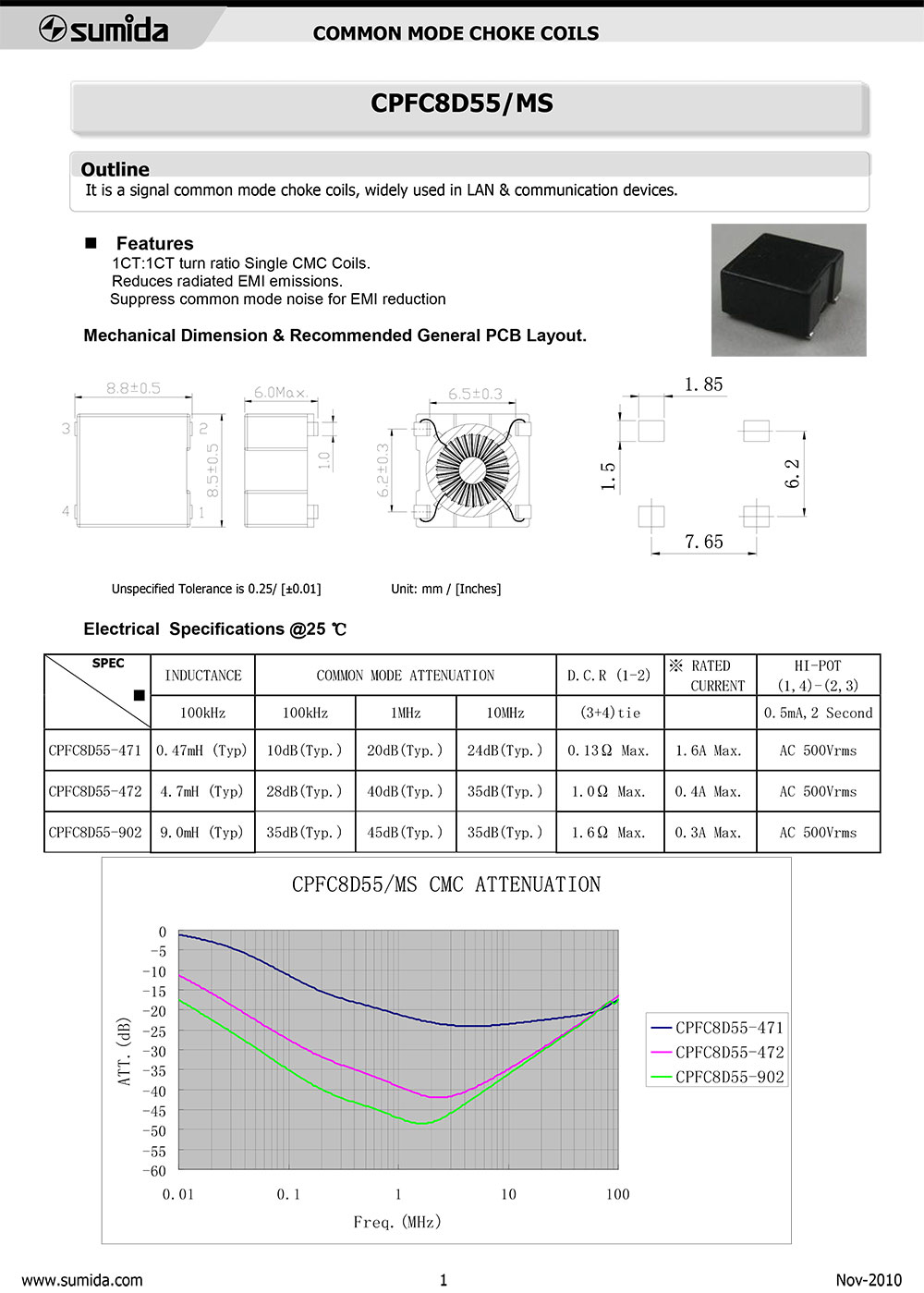 5.CPFC8D55MS廣泛用于電信、通訊行業(yè)及各類工業(yè)板卡的通訊端口以及局域網(wǎng)的的共模信號(hào)抑制。